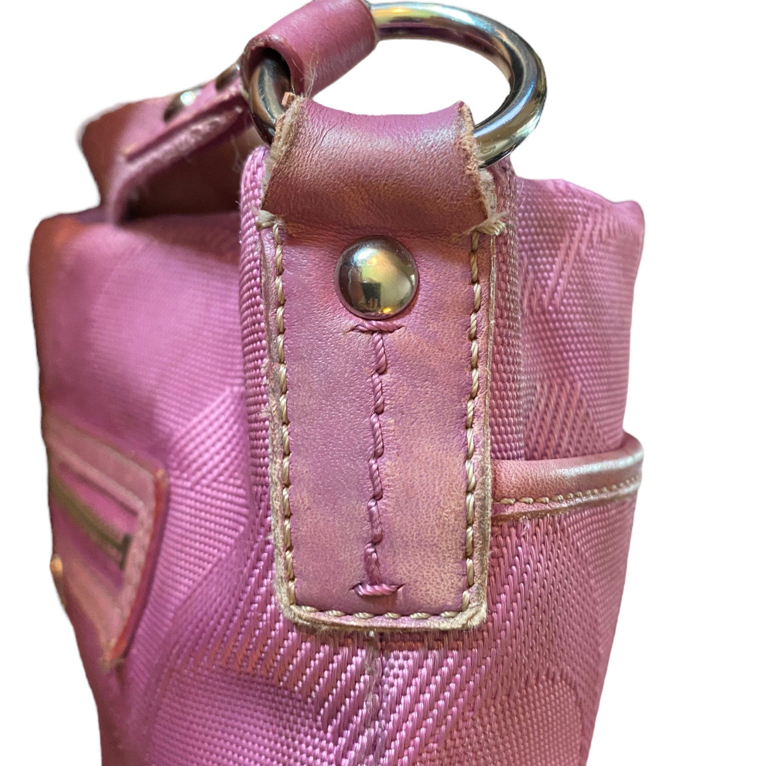 - Purple leather has scuffing, rubbing, pushed edges, please review photos
