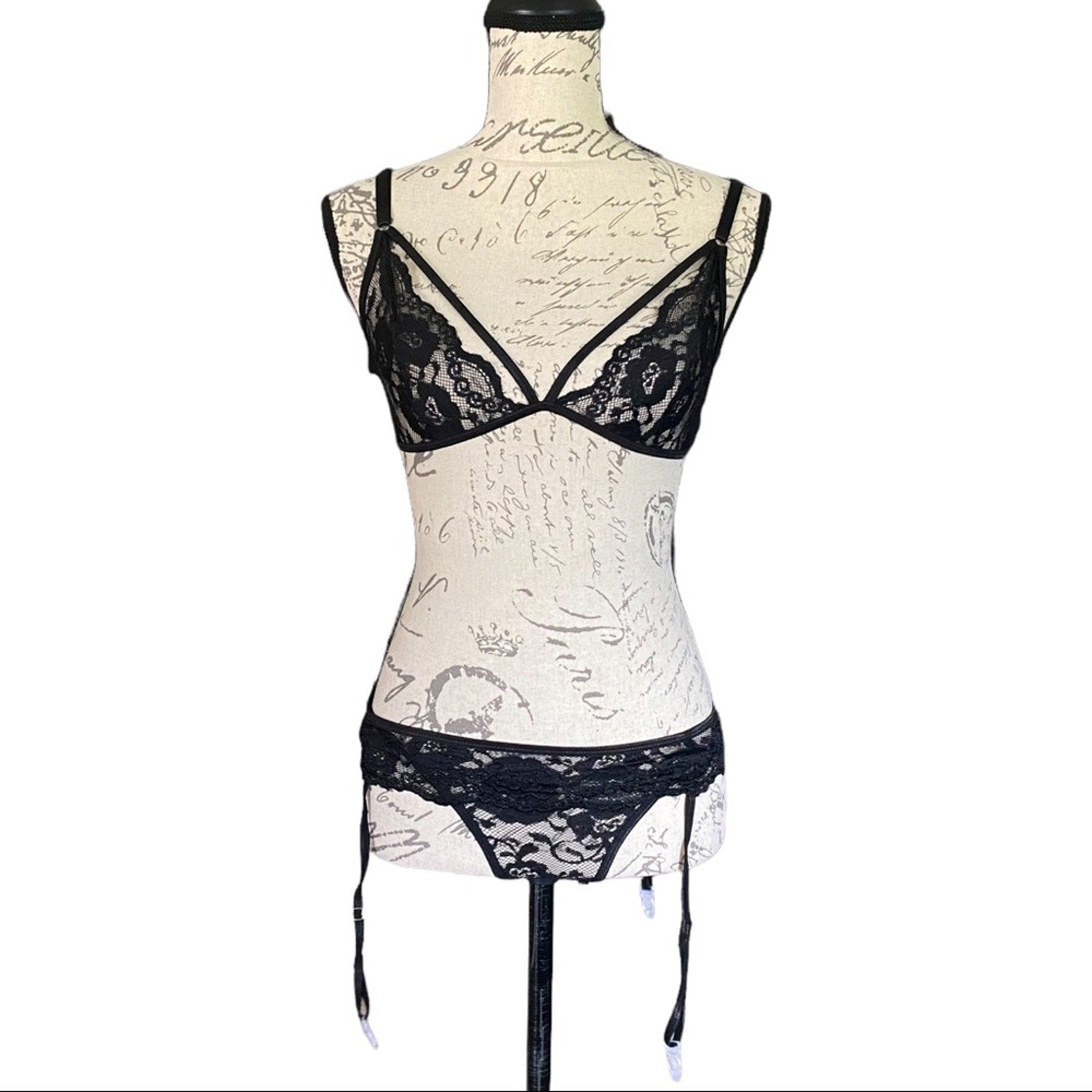 Black Lace 3 Piece Lingerie Bralette Panty Set Size Medium NWT